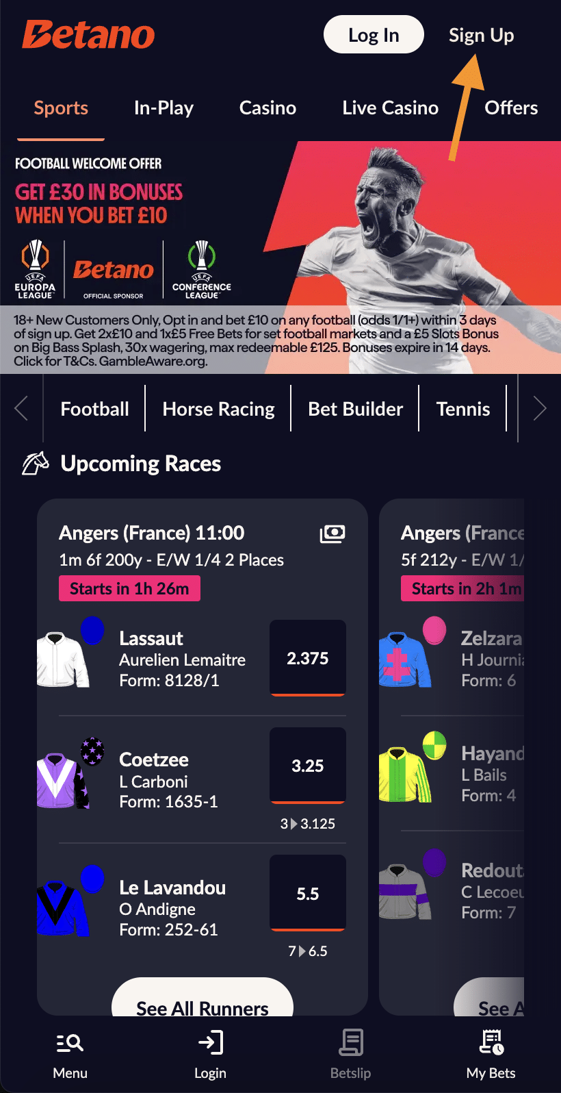 - Go to Betano.co.uk: Click the link to visit Betano’s official website. On the homepage, you’ll see a ‘Sign Up’ button.