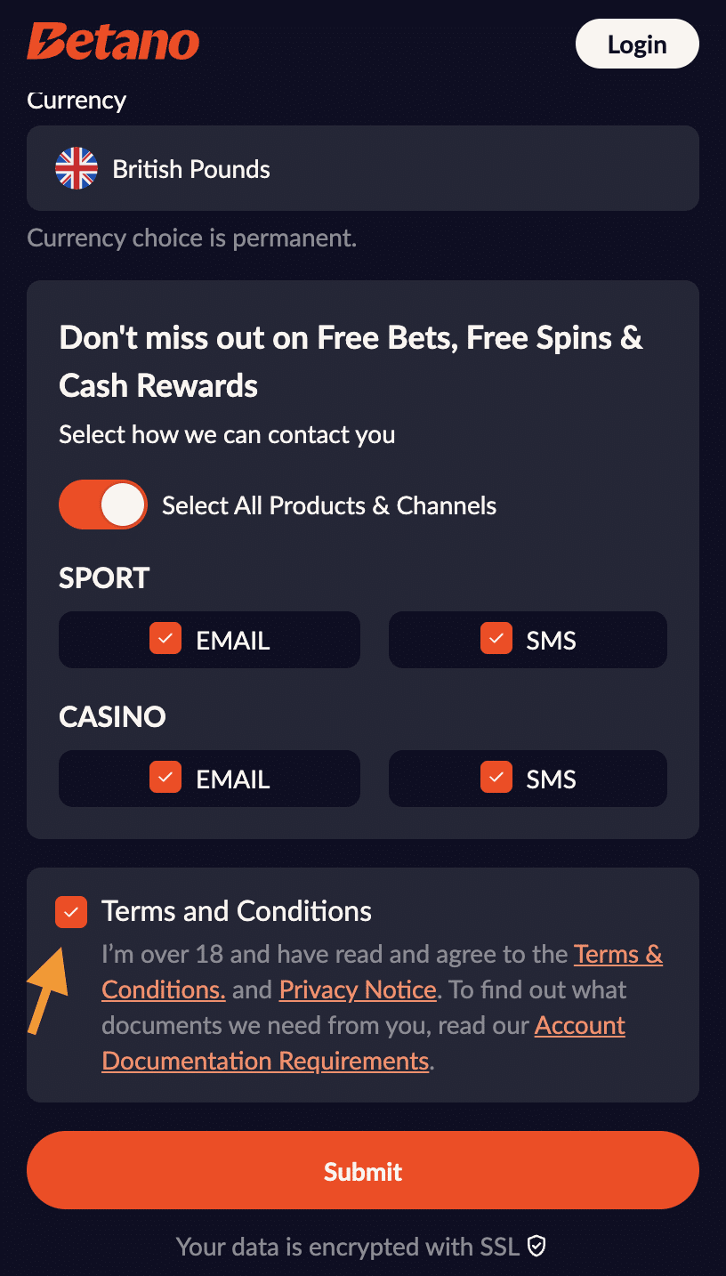 - Agree to Terms: Make sure to check the box agreeing to Betano’s terms and conditions. You’ll also need to opt into receiving promotional emails.